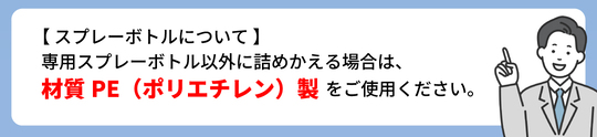 ●専用スプレーボトル以外に詰め替える場合、ボトル材質によっては変形や割れ等を引き起こすものがあります。